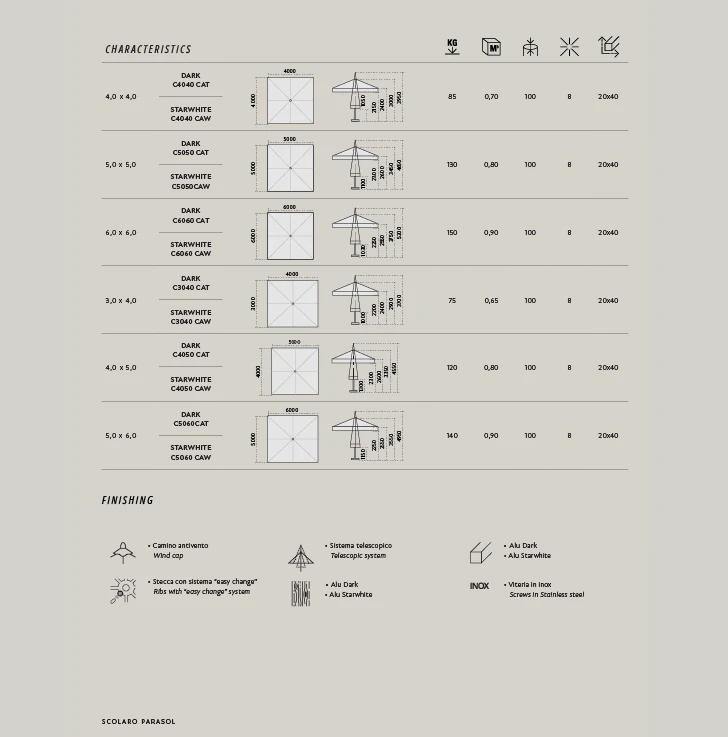 Capri, minimum yer kaplayarak maksimum alanı (6x6 metreye kadar) gölgelemek için tasarlanmış dev bir alüminyum şemsiyedir. Özellikle geniş restoran terasları ve kamusal alanlar için ideal olan bu model, teleskopik sistemi sayesinde devasa boyutuna rağmen kolayca yönetilebilir. İster "Dark" antrasit, ister "Starwhite" beyaz versiyonu olsun, Capri'nin güçlendirilmiş iç yapısı ve kalın profilleri, onu dış mekanın en zorlu şartlarına karşı dayanıklı bir kale haline getirir.
