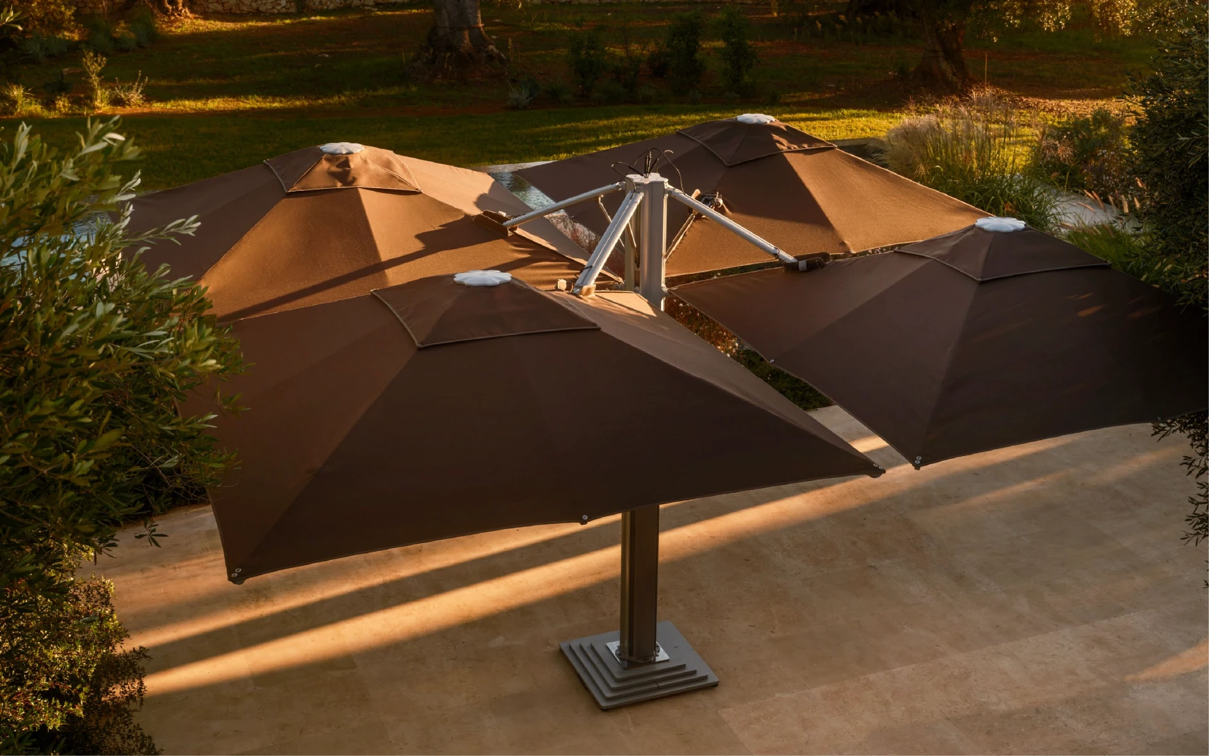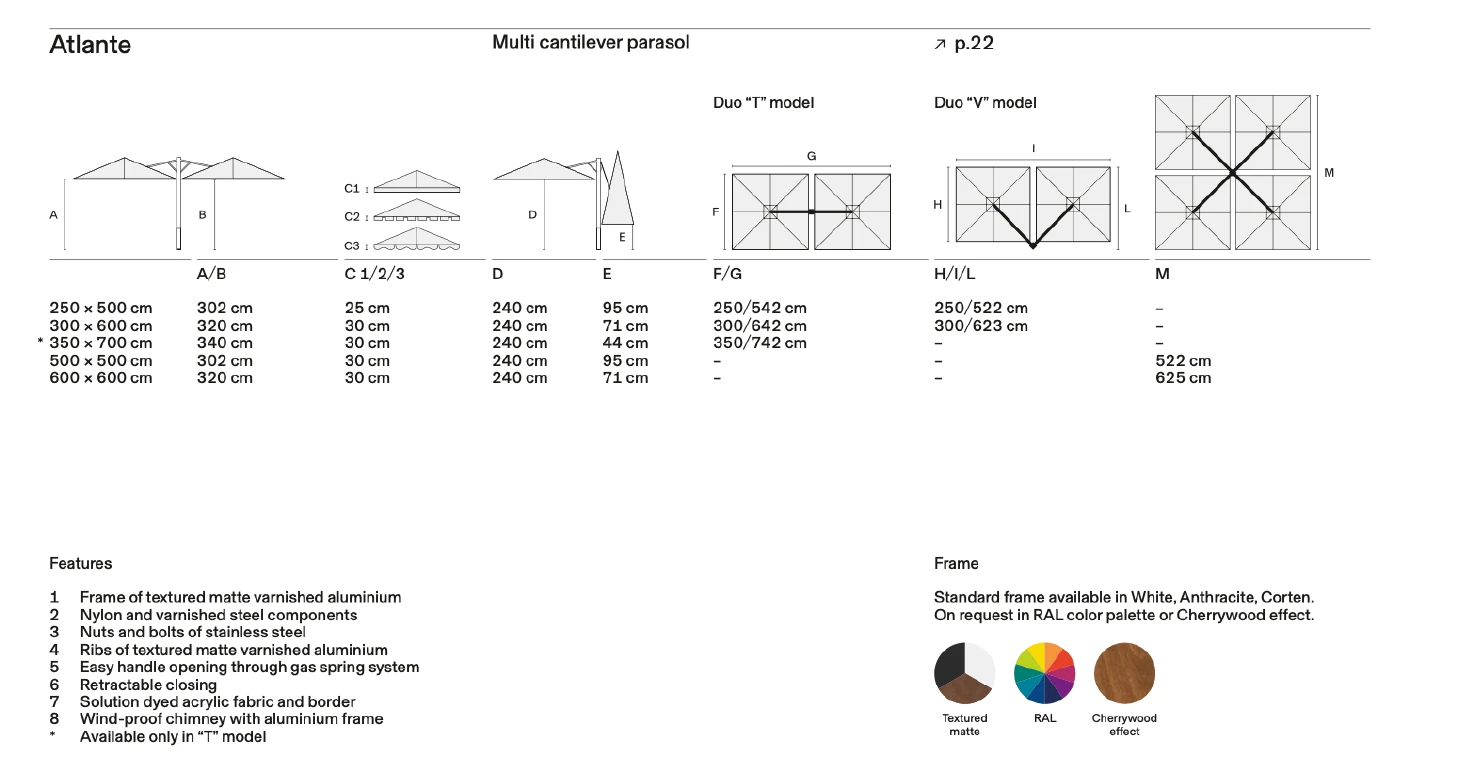 Atlante, tek bir merkezi direk üzerinden iki veya dört farklı şemsiyeyi yönetebilen, geniş alanlar için geliştirilmiş "Multi Cantilever" (çoklu yandan gövdeli) sistemdir. Özellikle restoran ve kafe teraslarında, direk kalabalığı yaratmadan maksimum gölge alanı (500x500 cm'ye kadar) sağlar.