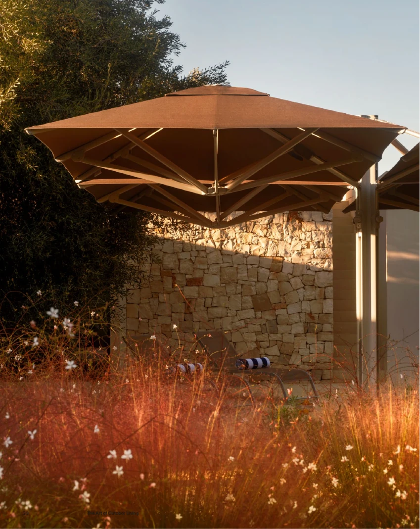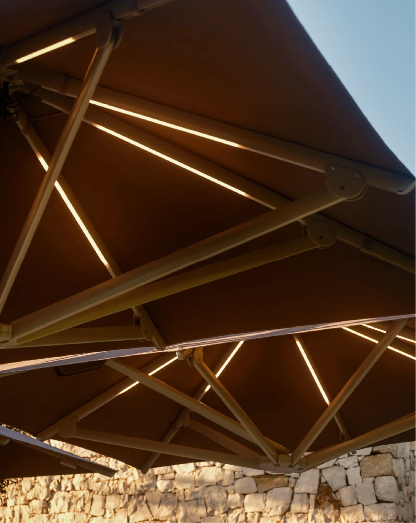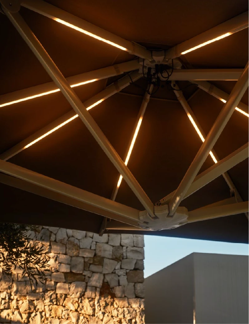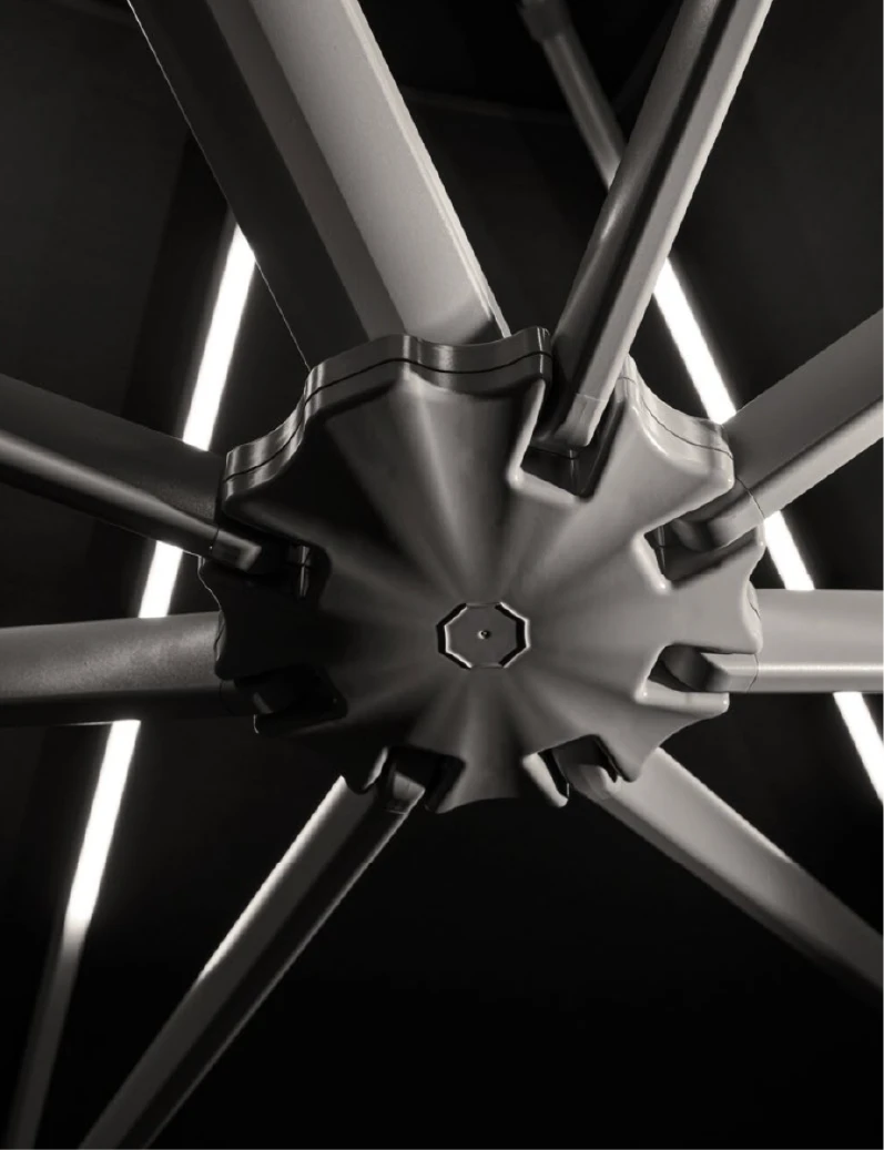 Her bir şemsiye, gazlı piston sistemi sayesinde efor sarf etmeden, tek bir hareketle kolayca açılıp kapanabilir. Mat vernikli alüminyum gövdesi, zorlu dış mekan koşullarına karşı üstün koruma sunar.