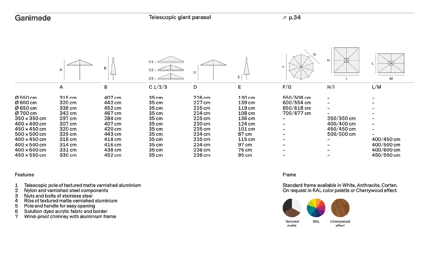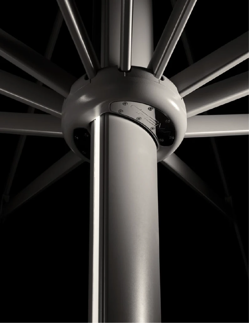 Ganimede Evo, Crema Outdoor'un en büyük ve en prestijli motorlu şemsiye modellerinden biridir. Teleskopik direk yapısı sayesinde şemsiye kapanırken yukarı doğru yükselir; böylece altındaki masa ve sandalyeleri toplamanıza gerek kalmaz. Tamamen motorize edilmiş sistemi, uzaktan kumanda ile yönetilir. RAL 9006 gövde rengi ve U224 kodlu özel kumaş seçenekleriyle sunulan bu model, otel ve geniş bahçe projeleri için profesyonel bir çözüm sunar.
