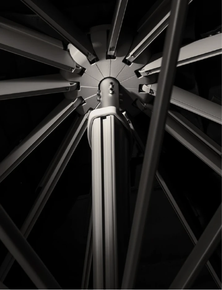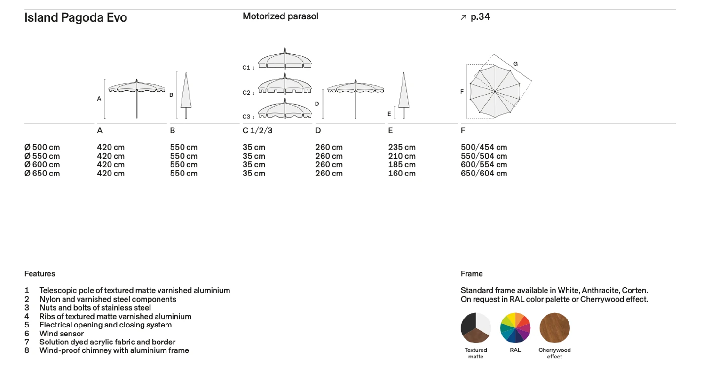 Island Pagoda Evo, egzotik "Pagoda" formunu devasa boyutlara taşıyan ve motorlu sistemle donatan eşsiz bir modeldir. 600 cm çapına ulaşan büyüklüğüyle, oryantal estetiği geniş ölçekli ticari alanlara uygular. Teleskopik direk yapısı ve entegre elektrik motoru sayesinde, bu devasa yapı tek bir tuşla zahmetsizce yönetilir. RAL 7006 gövde rengi ve çift renkli kumaş kombinasyonları (Canvas 106 & 0001) ile mekanlara dramatik bir görsel etki kazandırır.