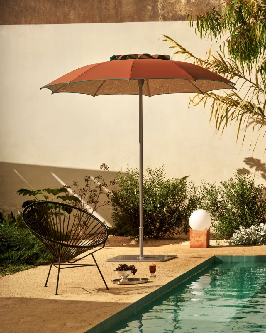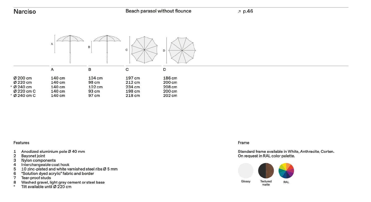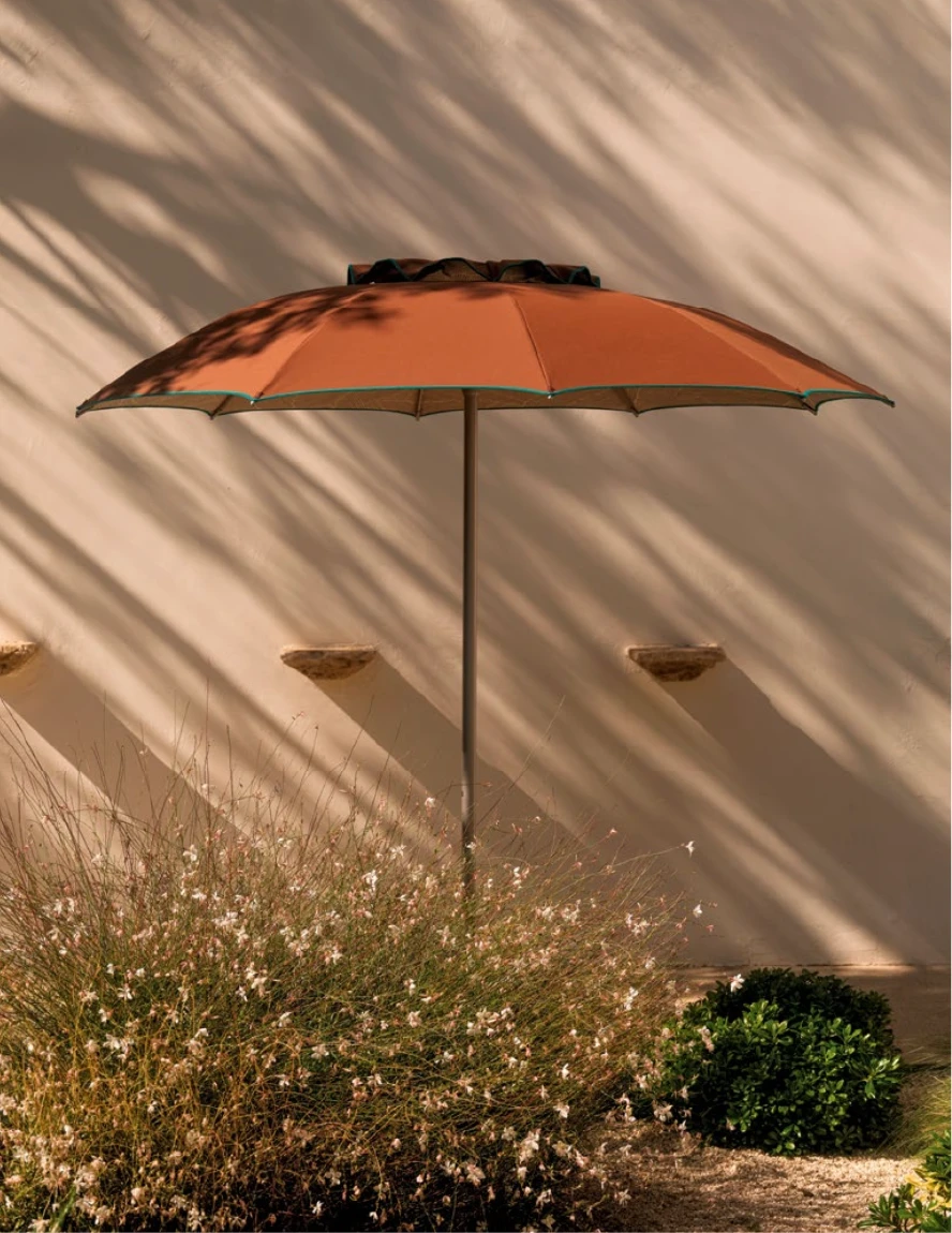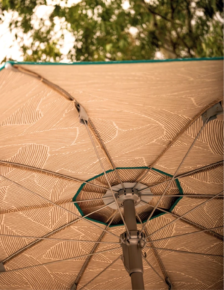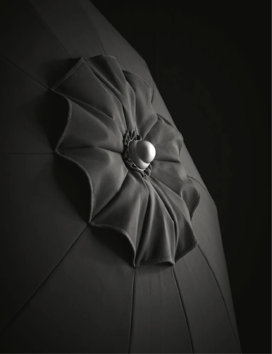 Narciso, şemsiye kenarlarında sarkan kumaş parçalarının olmadığı, "Without flounce" tasarımıyla minimalist bir çizgiyi temsil eder. Bu sade yapı, rüzgar direncini azaltırken, RAL 9022 (Açık Gri/Gümüş) alüminyum gövdesiyle modern mimariye uyum sağlar. İç ve dış kumaş renklerinin farklılaştırılabildiği bu model, sadelikteki şıklığı arayanlar içindir.