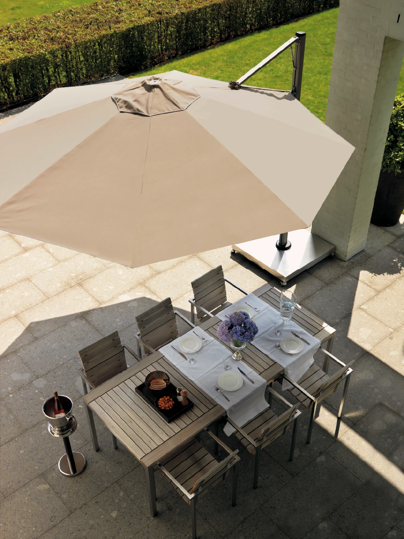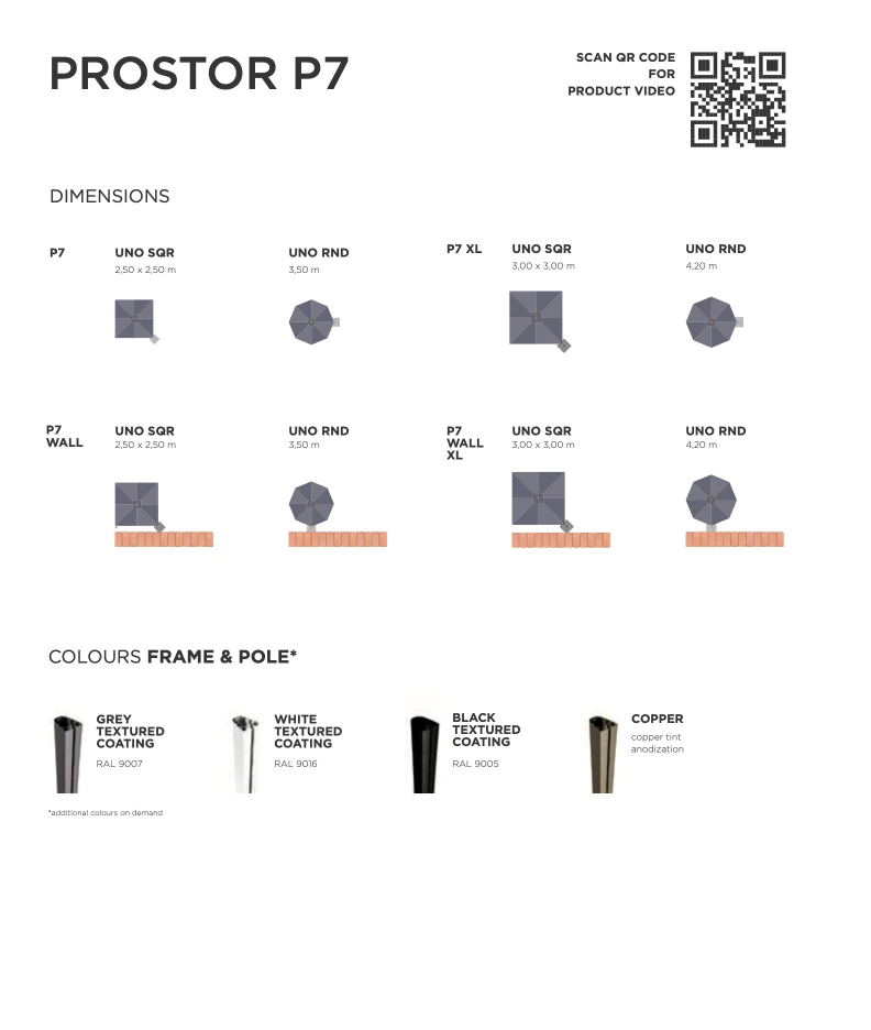 Prostor P7, gölgeyi günün her saatinde tam istediğiniz noktaya taşımanızı sağlayan, kendi ekseni etrafında 300° dönebilen yandan gövdeli bir şemsiyedir. Patentli "One Move System" sayesinde tek bir hareketle saniyeler içinde açılır ve kapanır. Gazlı piston desteği, kullanımı inanılmaz derecede hafifletir. Şık tasarımıyla özel villalar ve havuz başları için ideal olan P7, aynı zamanda köşe kullanımları için dönebilen duvara monte seçeneğine de sahiptir.