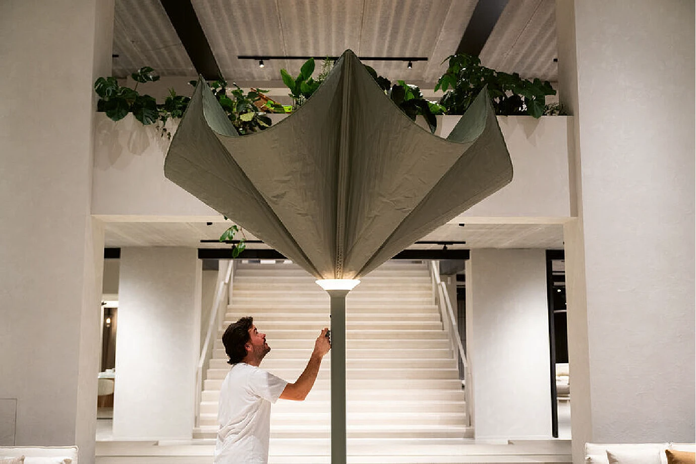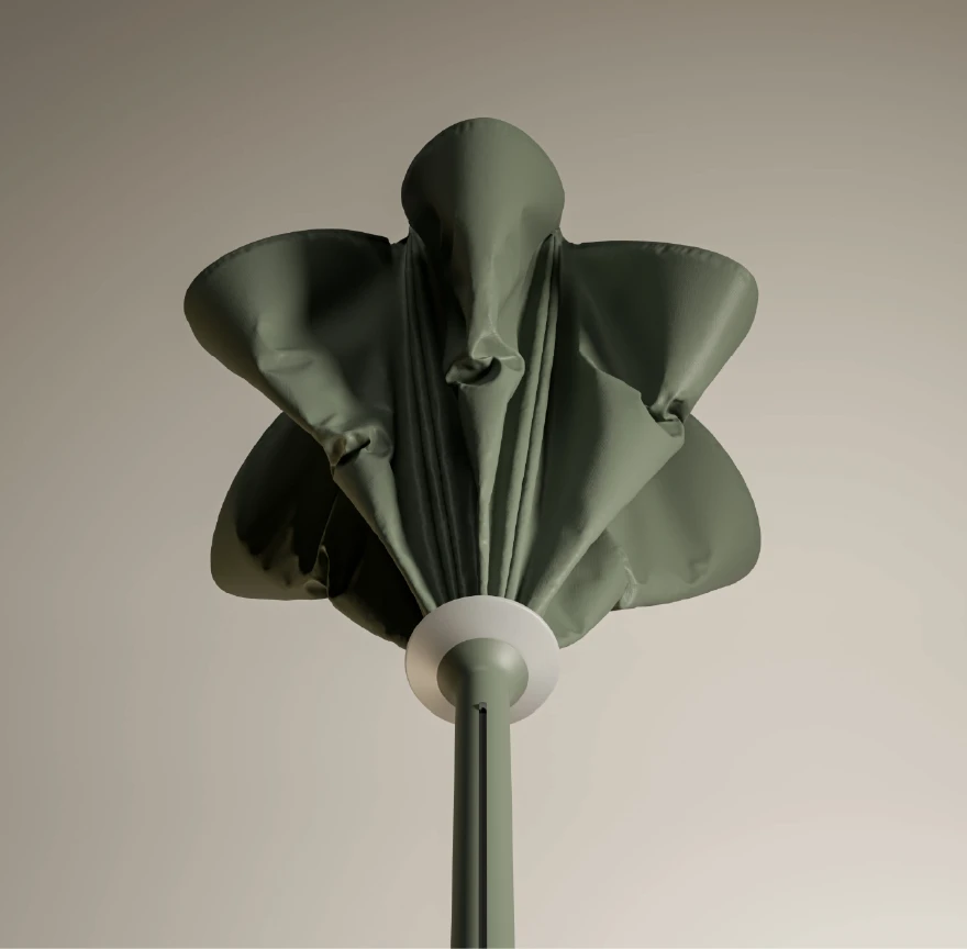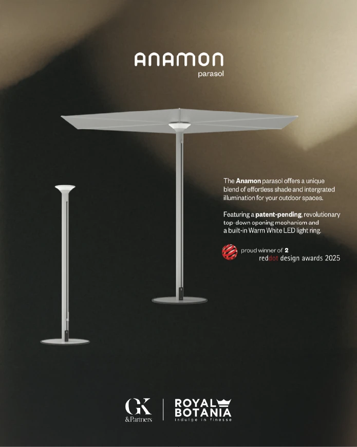 Kris Van Puyvelde'nin su altındaki tüplü anemonlardan ilham alarak tasarladığı Anamon, bir şemsiyeden çok daha fazlasıdır; gündüz gölge, gece ışık veren heykelsi bir sanat eseridir. Geleneksel şemsiyelerin aksine "Top-Down" (yukarıdan aşağıya) açılma mekanizmasıyla, bir çiçeğin açması gibi zarifçe gölgelik formunu alır. Kapandığında minimalist bir silüete bürünen Anamon, entegre, kablosuz ve şarj edilebilir sıcak beyaz LED aydınlatmasıyla geceleri büyüleyici bir atmosfer yaratır. 2025 Red Dot Tasarım Ödülü sahibi bu başyapıt, dış mekan lüksünün yeni tanımıdır.