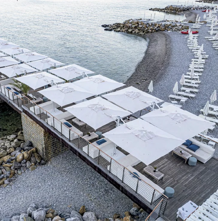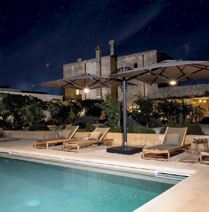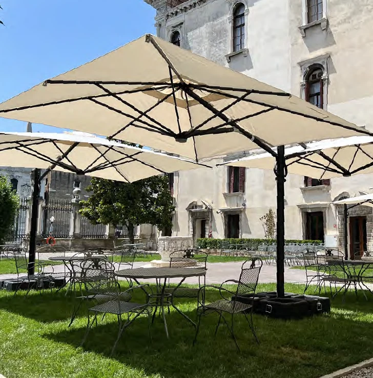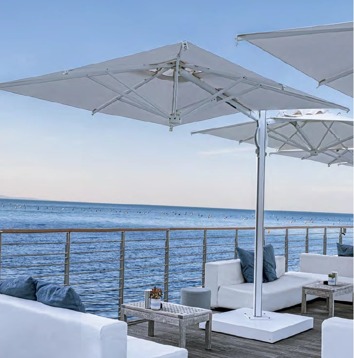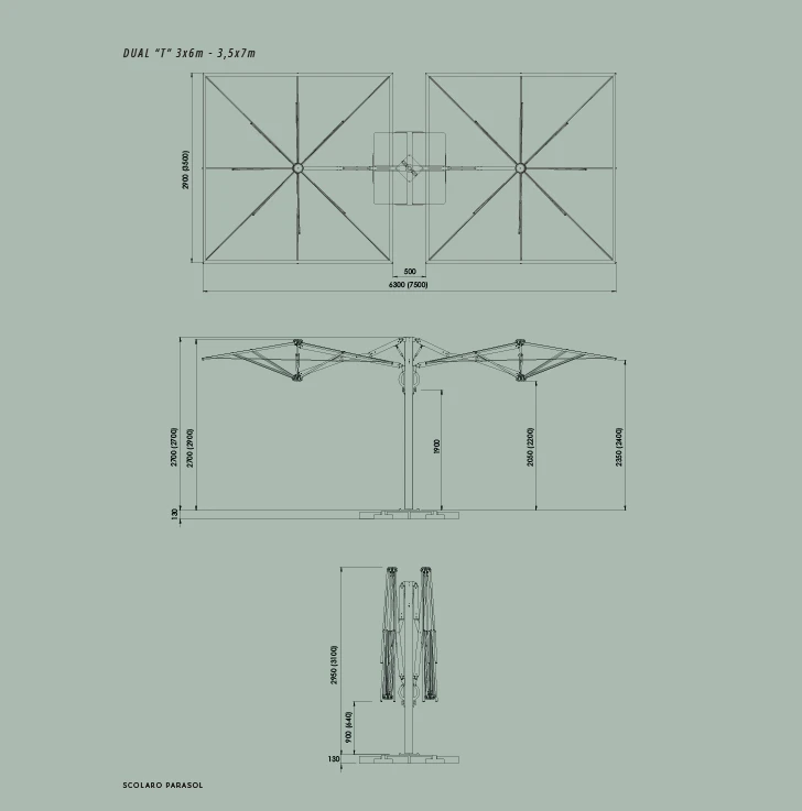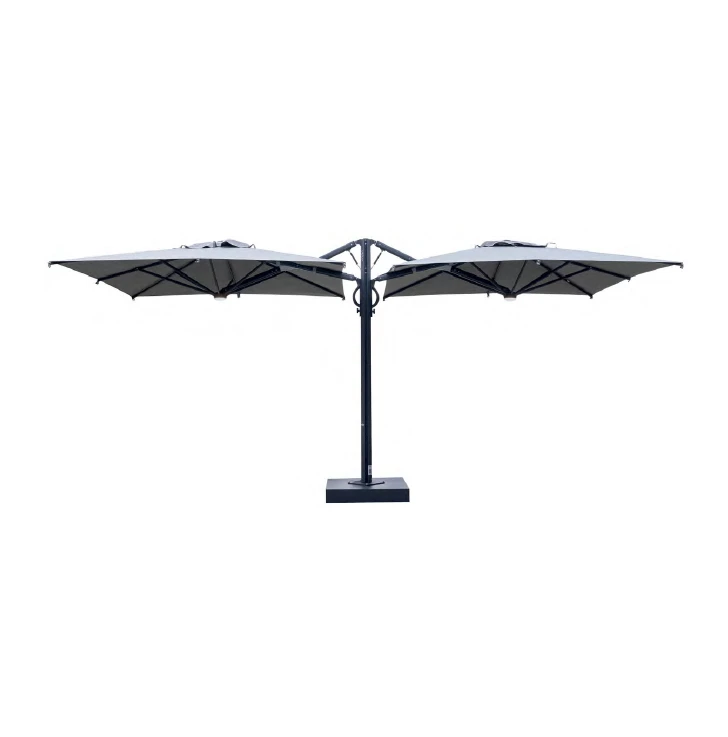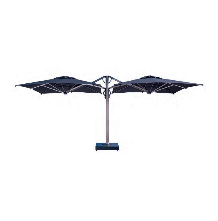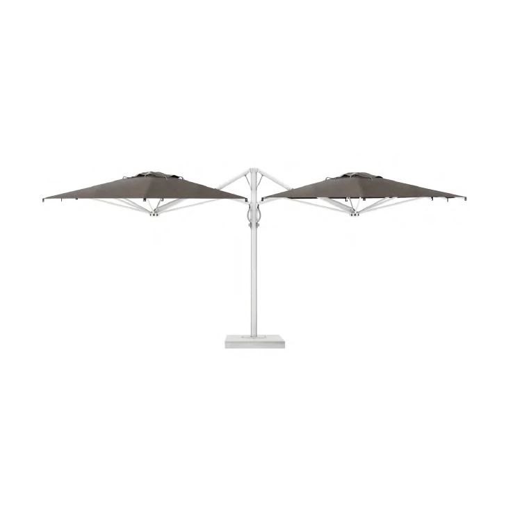 Dual T, tek bir taşıyıcı direk üzerinde karşılıklı (T-formunda) konumlandırılmış iki bağımsız şemsiye kanadından oluşan, simetrik ve dengeli bir sistemdir. Özellikle uzun yürüyüş yolları, restoranların ara bölmeleri veya dikdörtgen teraslar için ideal olan bu model, zemin işgalini minimize ederken gölgeyi maksimize eder. Yenilikçi "Motion" sistemi, her iki kanadın da gazlı piston yardımıyla yumuşak ve akıcı bir şekilde hareket etmesini sağlar. Modern mimariyle bütünleşen bu yapı, estetik ve fonksiyonelliği kusursuz bir dengede sunar.