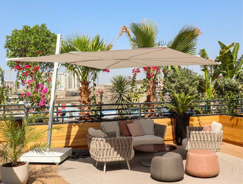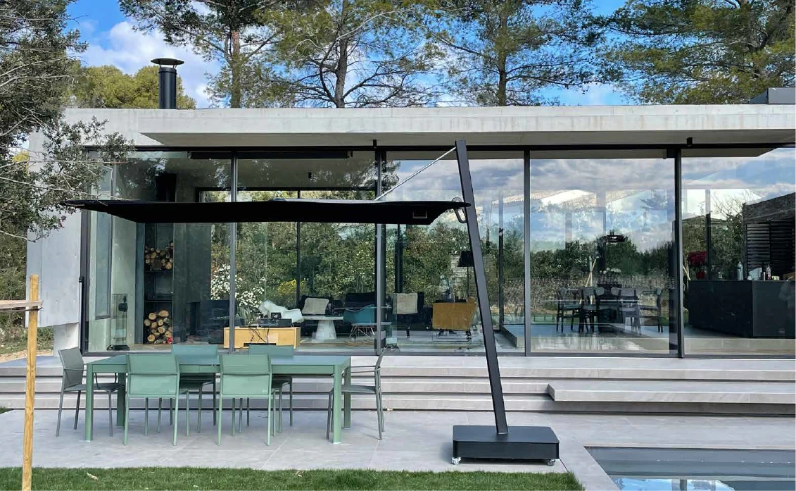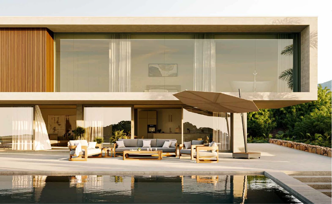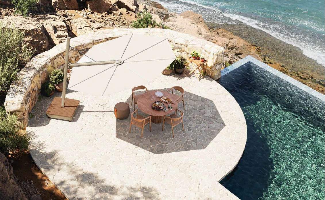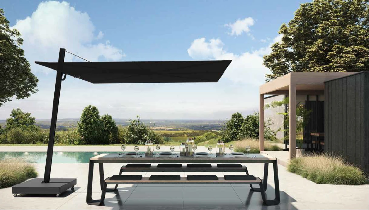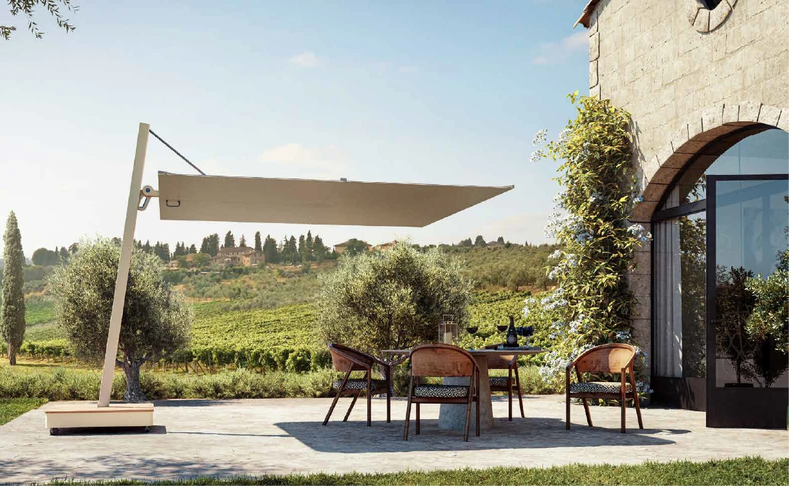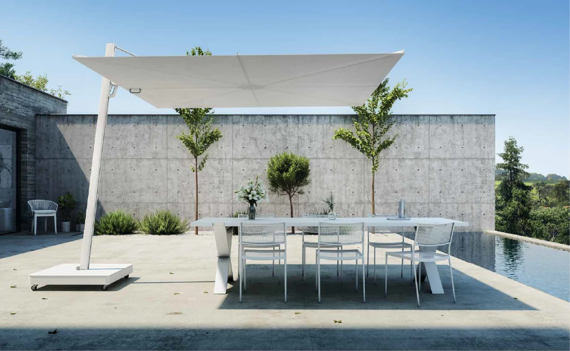 Versa UX, şemsiyeyi sadece bir gölge aracı olmaktan çıkarıp, tabanından kumaşına kadar uyum içinde tasarlanmış estetik bir objeye dönüştürür. "Full Black", "Architecture" veya "Sand" gibi özel konsept paketleri halinde sunulan bu model, mekanın dekorasyonuna tam uyum sağlar. Yandan gövdeli yapısı sayesinde şemsiye altındaki alan tamamen serbest kalır. Ergonomik kullanım özellikleri ile gölgeyi zahmetsizce yönetmenize olanak tanır.